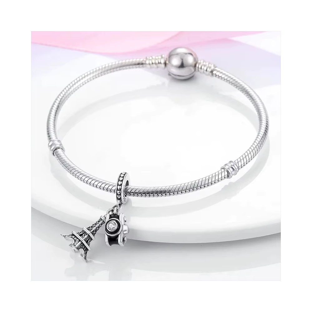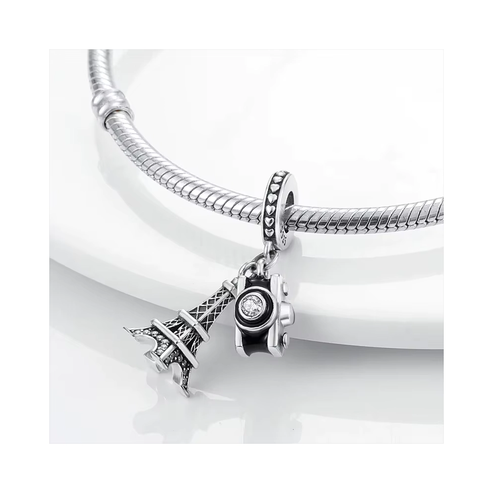 Su broche seguro facilita colocarlo y retirarlo en pulseras, collares o llaveros, garantizando comodidad y versatilidad. Perfecto para uso diario o como detalle en regalos, el Charm Colgante Torre Eiffel y Cámara aporta un toque elegante y único a cualquier accesorio.