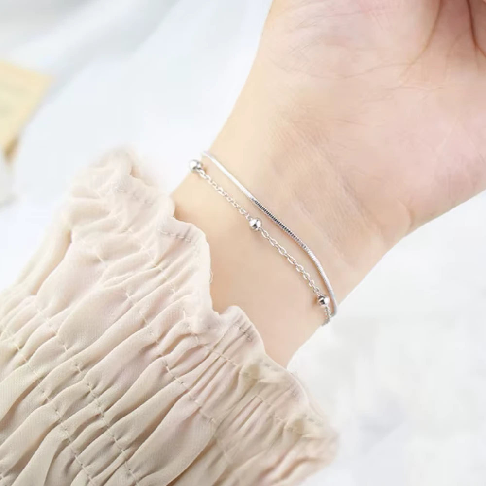 La Pulsera Doble Cadena Esferas Aurora presenta un diseño delicado y equilibrado que combina dos cadenas finas con esferas decorativas, creando un efecto visual armónico y elegante. Su acabado en tono plata aporta una estética limpia y versátil, ideal para complementar distintos estilos de forma sutil. Fabricada en acero hipoalergénico, es una joya resistente, ligera y cómoda para el uso diario. El largo base de 15,5 cm más extensión permite un ajuste adaptable, manteniendo una caída natural sobre la muñeca.