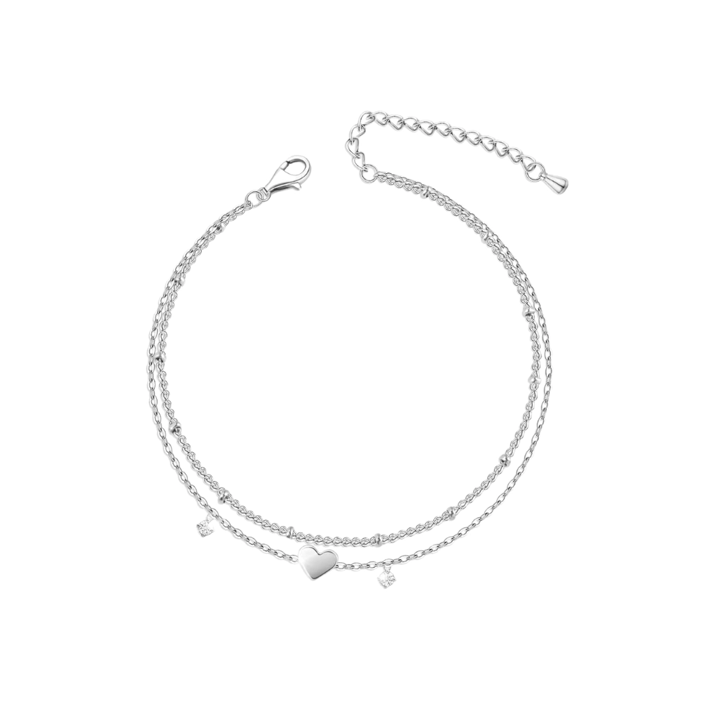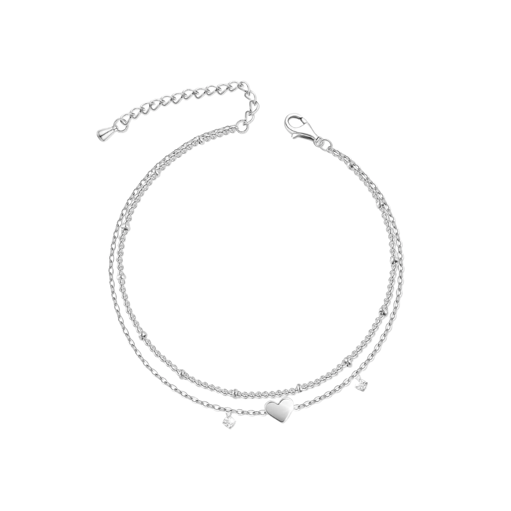 Cuenta con doble cadena, lo que añade dimensión y un efecto visual más llamativo. Con un largo de 21 cm más 6 cm de extensión, la Tobillera Plateada Con Circonitas y Dije Corazon permite un ajuste versátil y adaptable a distintas medidas. Es perfecta para quienes buscan un accesorio femenino y decorativo con un toque de brillo sutil.